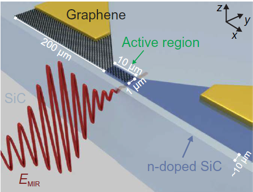 This unusual experiment places some demands on the diode: it must be able to withstand very strong light fields and be transparent. Therefore, epitaxial graphene was chosen as the metal and silicon carbide – a high-performance semiconductor with a long research tradition in Erlangen. In a high-temperature process, epitaxial graphene, a one-atom-thin layer of carbon that behaves metallically, can be grown onto the semiconductor. This smallest possible expansion is advantageous because then the electrons do not have to travel a long way through the metal. The FAU group led by Prof. Dr. Heiko B. Weber has already been able to show that this metal-semiconductor combination behaves like an ideal, transparent Schottky diode over a wide range of frequencies – from the DC voltage range up to 500 gigahertz.